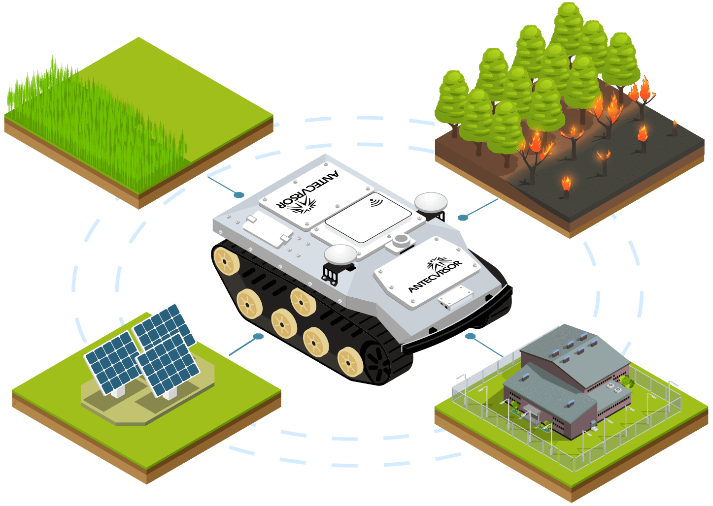 La gama de robots Antecursor es capaz de operar de manera completamente autónoma gracias al empleo de sistemas de comunicación redundantes que incluyen red satelital y red 4G/5G, lo que le confiere una capacidad de implantación global.